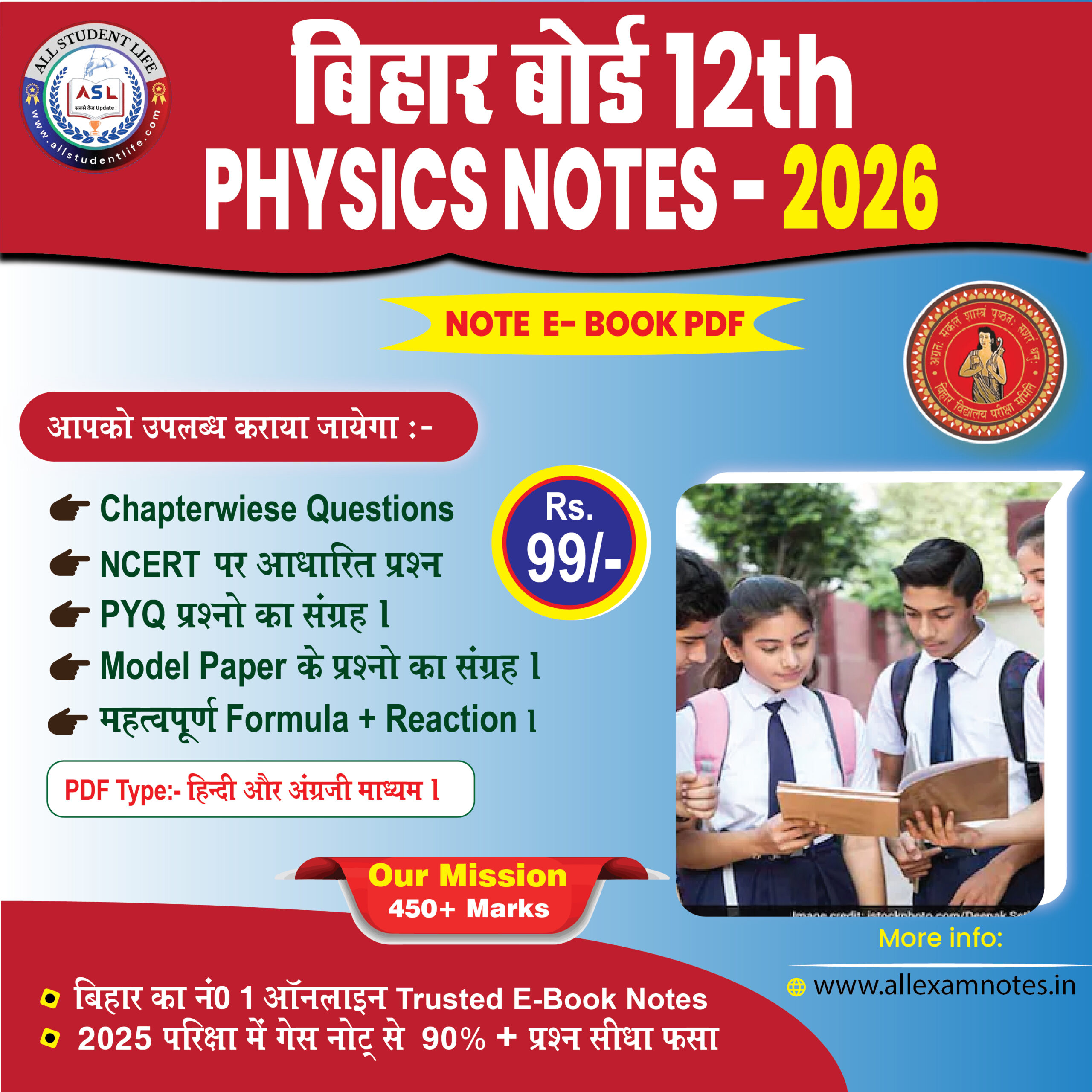 बिहार बोर्ड की 12वीं कक्षा की परीक्षा देश के सबसे बड़े बोर्ड परीक्षाओं में से एक है, और हर साल लाखों छात्र इस परीक्षा में सम्मिलित होते हैं। यह परीक्षा विद्यार्थियों के भविष्य की नींव रखती है। ऐसे में अच्छी तैयारी और सटीक अध्ययन सामग्री का होना बेहद जरूरी हो जाता है। इसी को ध्यान में रखते हुए हम आपके लिए लेकर आए हैं — बिहार बोर्ड क्लास 12th (इंटरमीडिएट ) 2026 के लिए एक बेहतरीन और संपूर्ण Notes E-Book (PDF Format) जो हर छात्र के लिए बेहद उपयोगी साबित होगी।